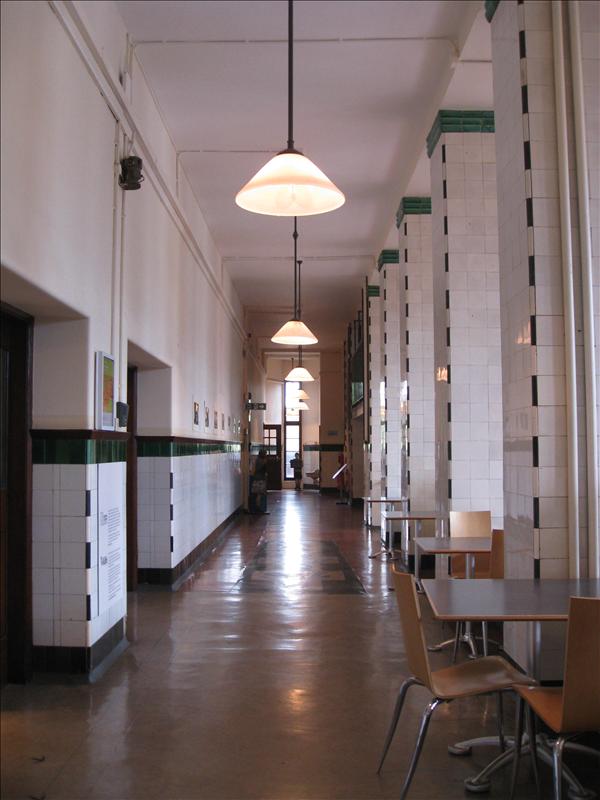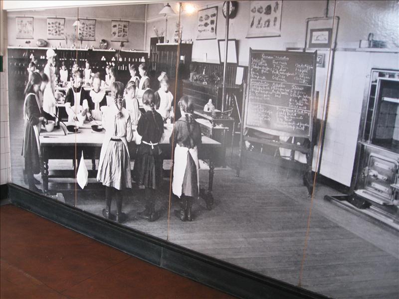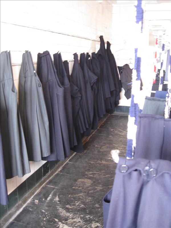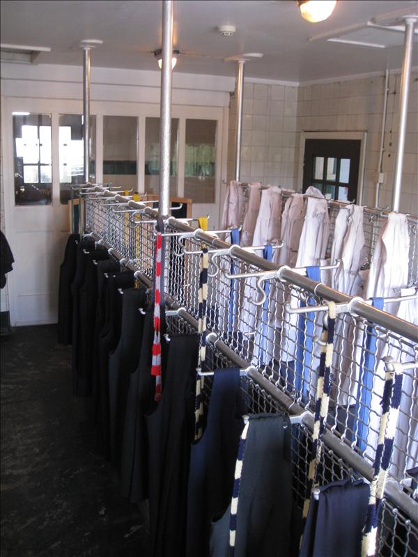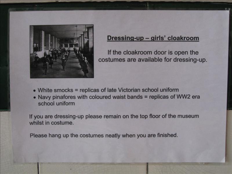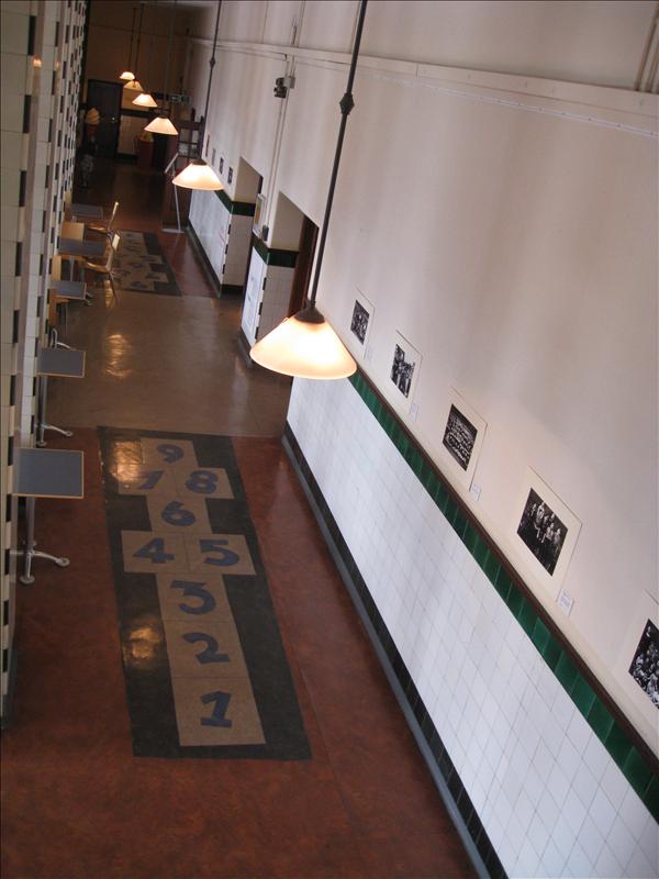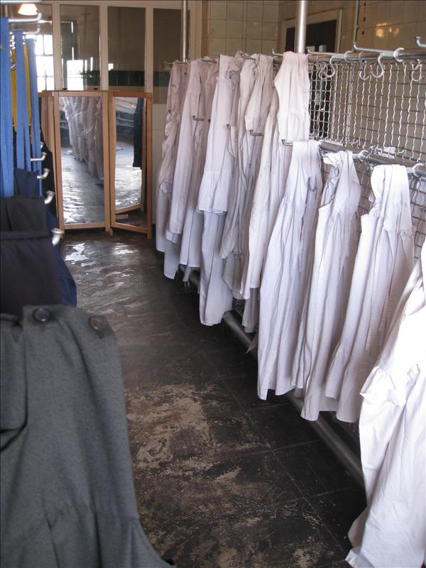 樓梯間的牆上展示著當時學生的照片,感覺很像在看電影;接著來到女子更衣室,置放著衣服非常整齊,內有圍裙,也有制服,站在此拍照時,我想起高中時,因為是女校,進高中時,原先以為唸女校會比較有氣質,但那就錯了!因為大家都是女生,完全沒有矜持可言,只有更放浪形骸阿!誰去廁所換體育服阿!窗簾拉上,全班開始換衣服,連門也不鎖!因為很熱,總是拿裙子搧風!我只能說......女生一群~太"豪放"了!