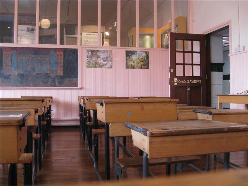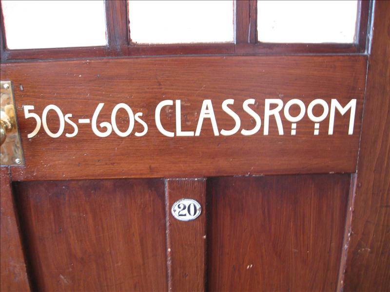 上課囉!進教室吧!這間教室是呈現五六O年代的教室景況,或許我們在迪士尼頻道偶爾還可以看到,事實上與現代部分西方國家或許差異不大,但我想走入這間教室,引領我們的是一個「回憶」,你參觀著這間老舊的教室,腦子裡轉動的卻是你的國高中生活,或許這是這間博物館存在的意義,人的一生,有許多事無法留住,但唯一永遠存在的是那份「美好的回憶」!