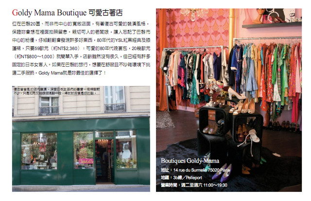 說真的,這間店因為地段偏遠,非觀光區,因此已經讓我撲空好幾次,不知道該不該為自己的荷包感到高興!但Goldy Mama太有趣,老闆娘非常的可愛,採訪當天一直從後面不斷地拿尚未上架的新貨給我看,天阿~Madame,要不是我那天太忙,我肯定是耗在那到她關門,那件YSL經典的紅白黑七分裙太經典了,要不是尺碼太大,一定是立即就敗回家,如果妳穿38-42號之間的話,那巴黎二手店絕對是妳的天堂了,也是我這個懶惰的女人當女人導遊時,必帶景點啦!